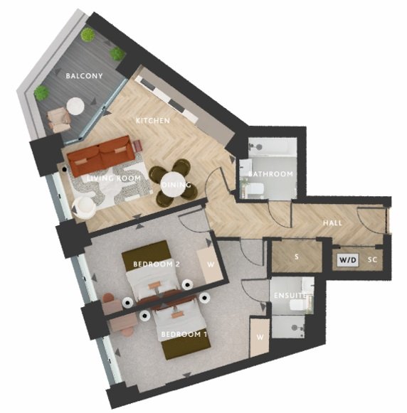 All apartments feature private balconies, open-plan living areas, floor-to-ceiling windows, high-quality kitchens, underfloor heating and high-speed fibre broadband infrastructure.