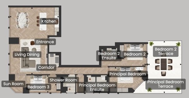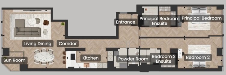 Tüm konutlar; lüks iç tasarım, yerden tavana camlar, üst düzey doğal ışık ve Londra silüetine uzanan panoramik manzaralar ile tasarlanmıştır. Manzaralar arasında Thames Nehri, Westminster ve çevresindeki ikonik yapılar yer alır.